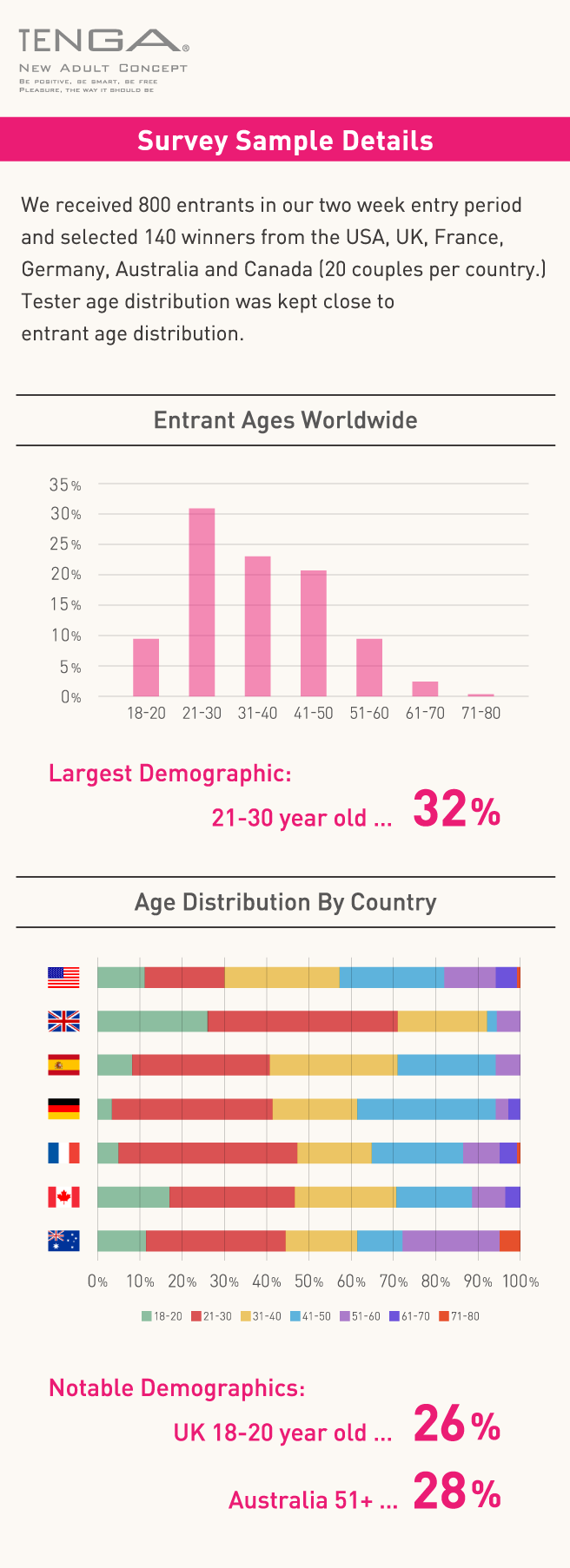 We received a total of 800 entrants in our two week entry period, with 140 winners chosen from the USA, UK, France, Germany, Spain, Australia and Canada (20 couples per country.) We aimed to keep the demographics of our testers close to the age distribution of the original 800 entrants.